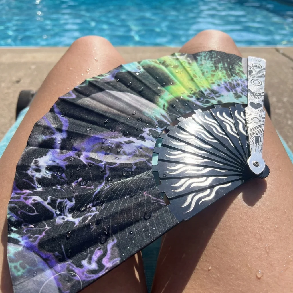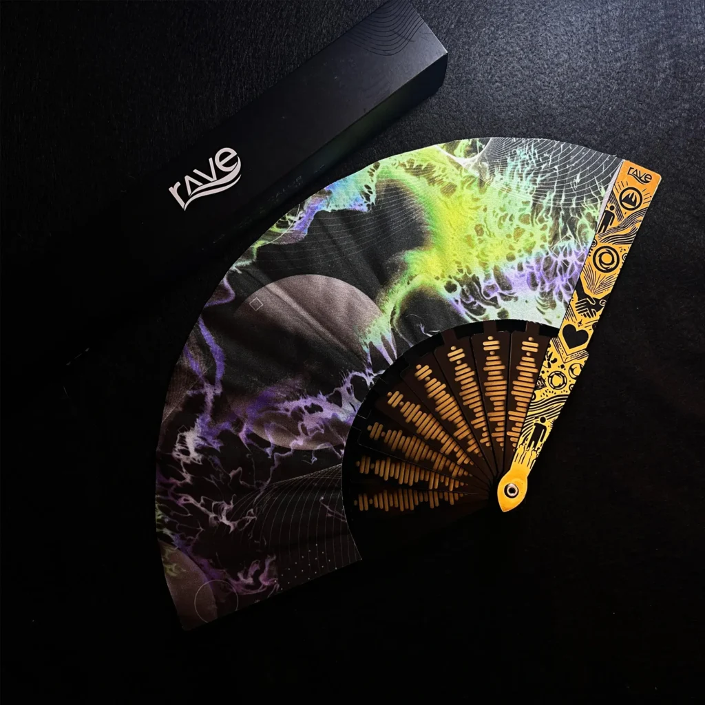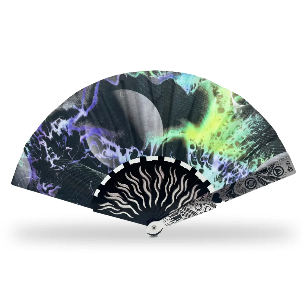 En el centro se distingue una especie de luna industrial, como si fueras parte de una rave escondida en algún galpón perdido. Las varillas negras con detalles plateados mantienen la estética fría y precisa, acompañando cada golpe del abanico como si fuera parte del set.
