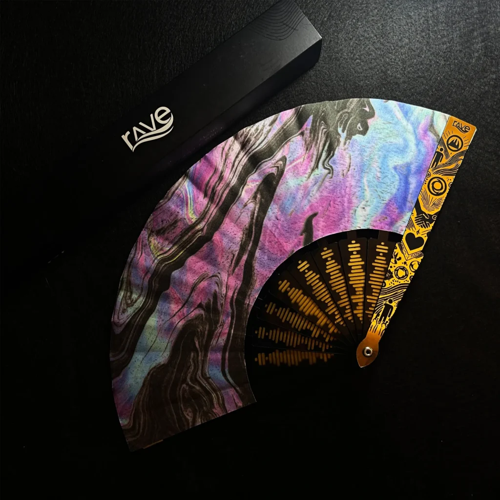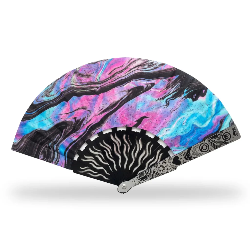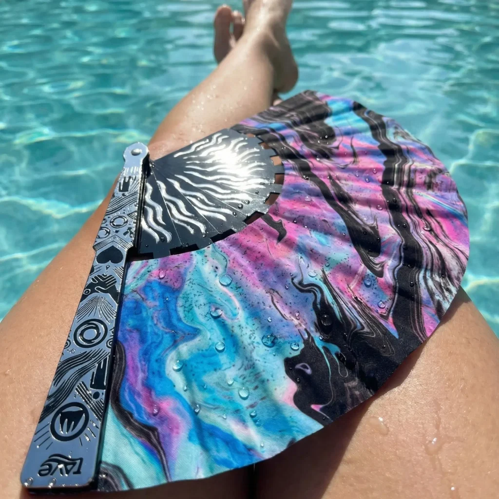 Con sus tonos rosa, azul y violeta que se mezclan como si fueran un track en loop, este abanico tiene la misma energía que un buen warm-up: suave, hipnótico y listo para levantar el mood de cualquiera.