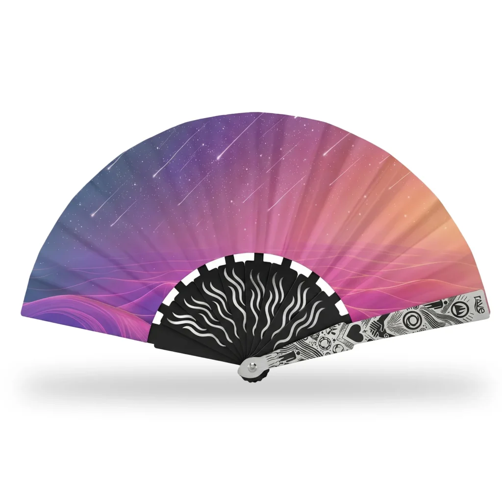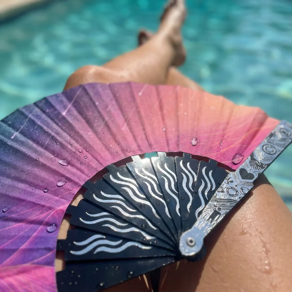 Las líneas del diseño parecen olas de color moviéndose al ritmo del viento, y las varillas negras con detalles plateados le aportan ese toque moderno que equilibra lo dulce con lo canchero.